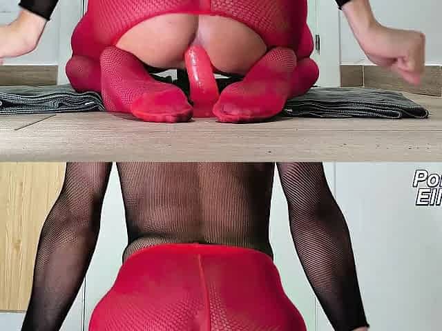 Trans in red hose and fishnet bodysuit rides sex-toy very fast and hardcore 08-08-2025