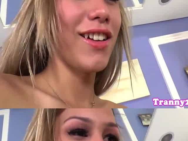Blonde tranny babe gives deep throat to two guys in an interracial threesome