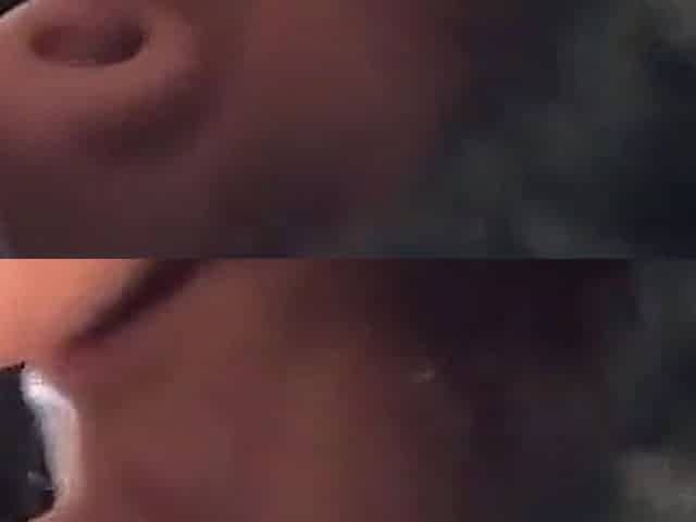 Ebony slut in a shiny corset and a mesh shirt gives her man head