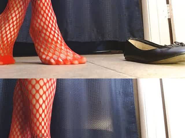 Red Fishnets Ballet Flats Shoeplay Dipping Toe Wiggling