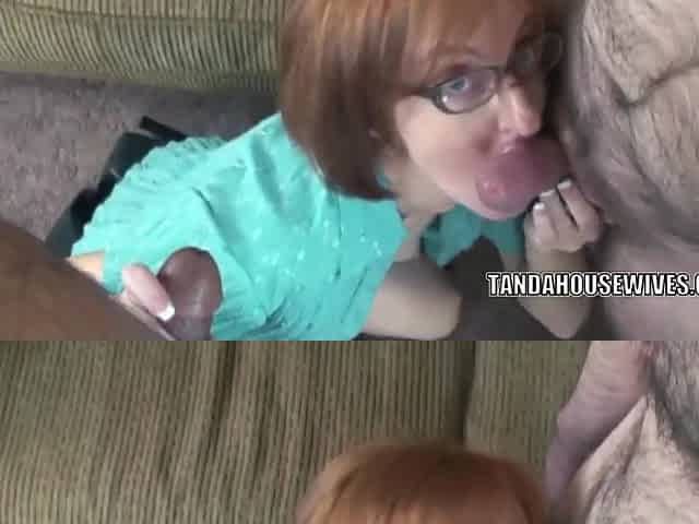 Mature redhead Layla Redd in a short skirt while she swallows two stiff cocks