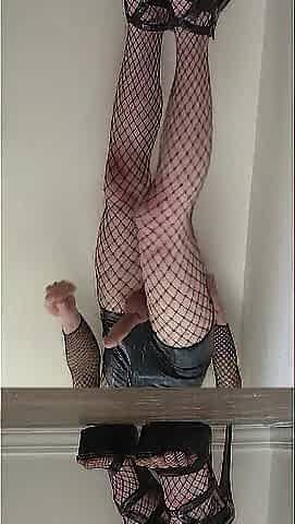Latex Shorts, Brassiere, and High Heel Sissy in Fishnets Edges