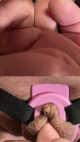 Sissy's cumming in public in chastity cage