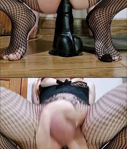 SISSY WHORE W/ BUTT-RAMMING, Plays with EBONY SEX TOOL and EATS HER CUM