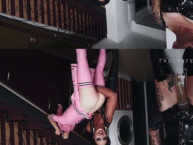 Real latex CFNM dominatrix pegs subs butt with ding-dong toy