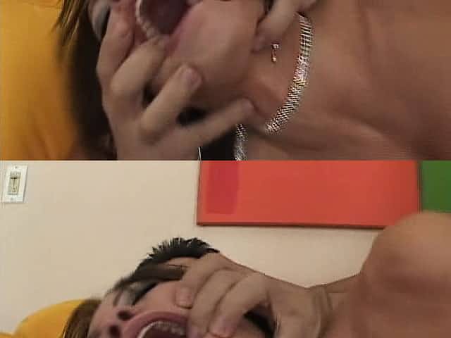 Slim blonde has two studs drilling her holes and filling her mouth with hot jizz