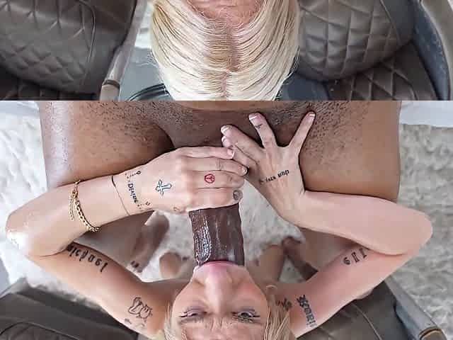 Skinny Blonde Naked Slut Sits On A Couch While Sucking On 2 Bbcs