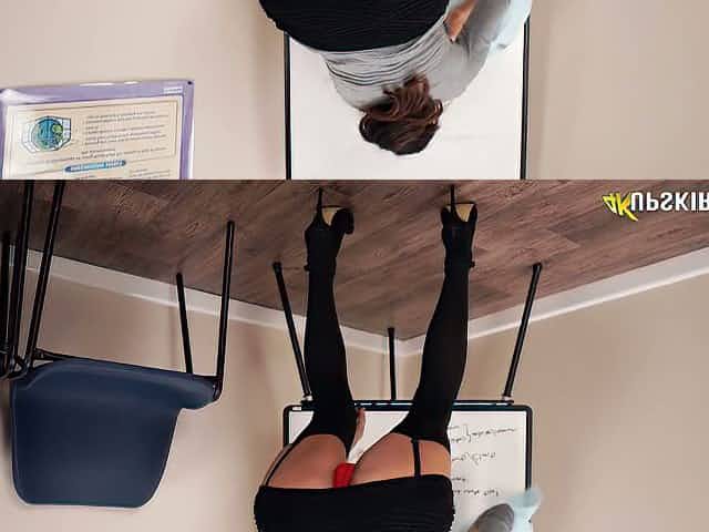 Young pretty brunette babe with small boobs and long hair in pantyhose and tight skirt reveals her tight firm bums to tall stud