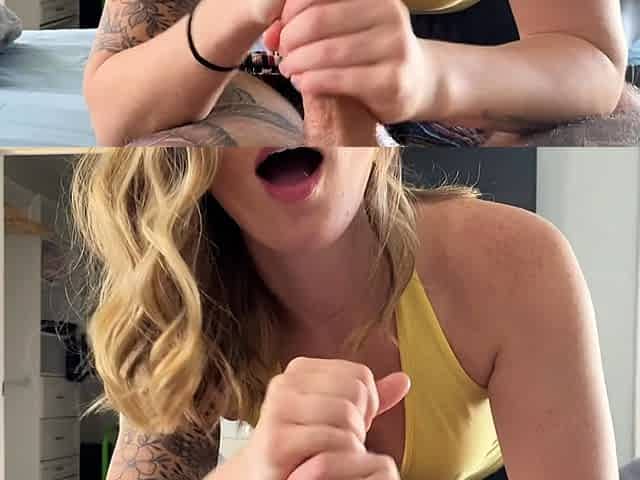 Blonde bombshell gives a sloppy blowjob before getting a cumshot