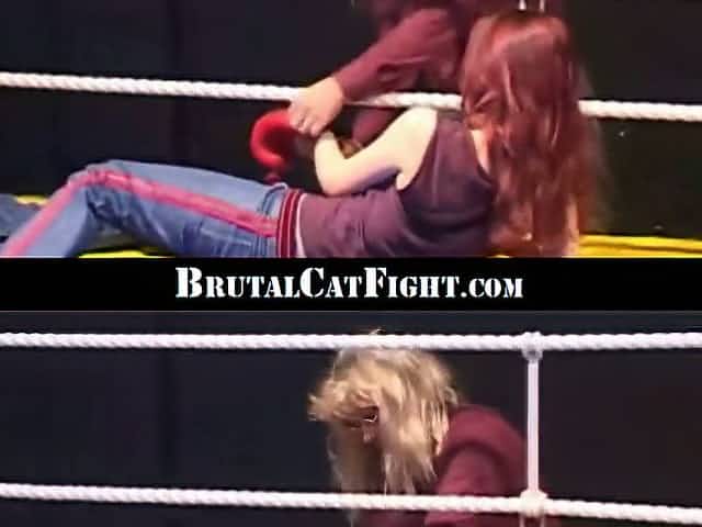 Martial red-haired bitch gives a head to a judge on squared ring