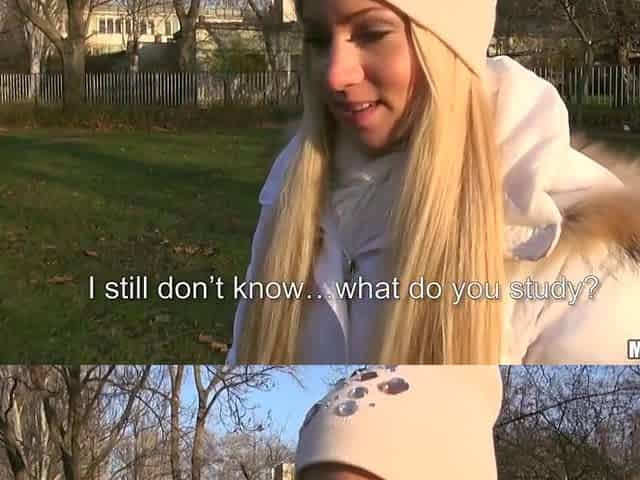 The blonde smokes a cigarette in the countryside, a guy passes by and puts his hard cock in her mouth