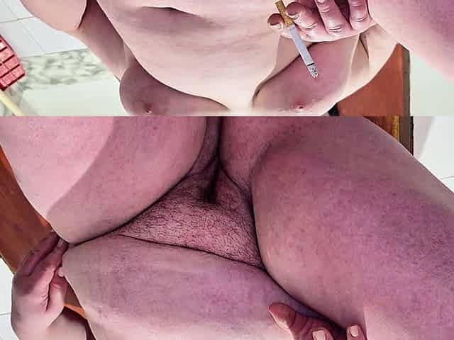 I smoke a cigarette and this chab discloses my sagging bazookas and gives me a sex toy to play with