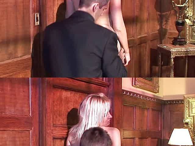 Geeky dude gets his tool sucked by an enthusiastic blonde bimmbo when he visits a house