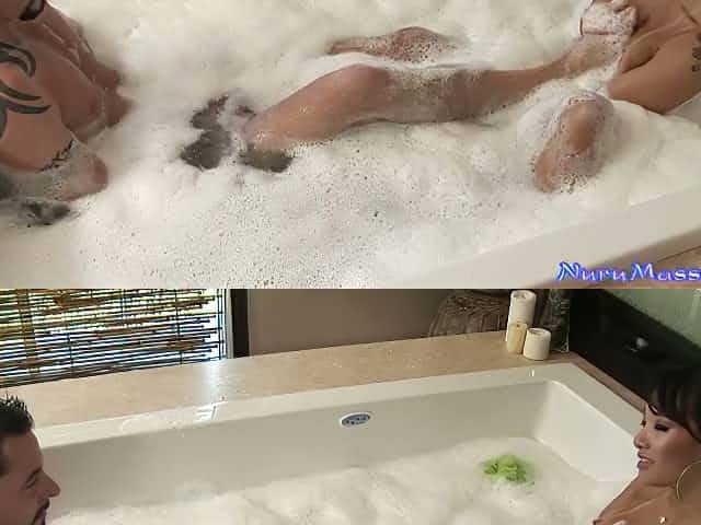 Super sexy Asian porn model Asa Akira is pleasing her client in the soapy bathtub
