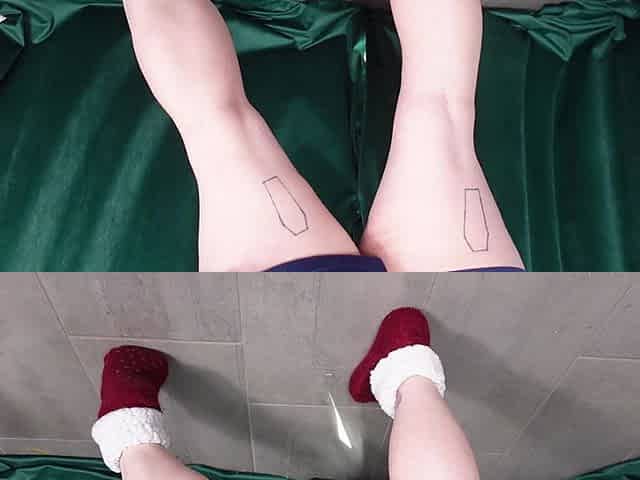 Flexing Muscular Calves in Thick Burgundy Socks with White Cuff