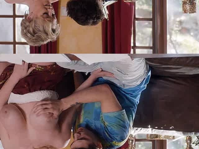 MMF threesome on the sofa with a mature blonde - Angelica