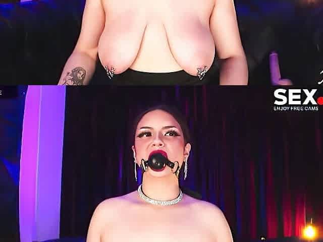 Saggy-boobed brunette with gag in mouth fucks her wet vagina