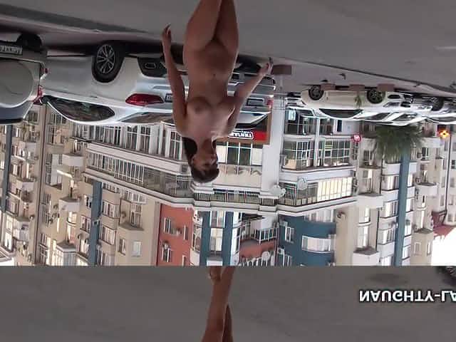 Beautiful woman undressing on a balcony in the city center. Public nudity