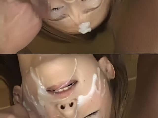 Sassy brunette girl gets her face all covered in jizz
