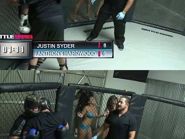 A cage fighter takes off the ring girl's bikini and fucks her