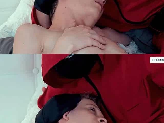 "Accidental cum squirt on chest , using leak cum as lubricant for foreskin sneaking"