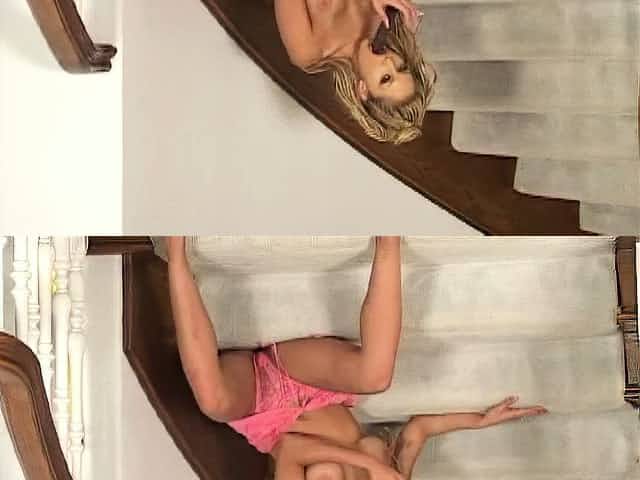 Big breasted blond fingering self on stair