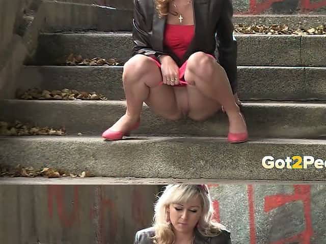 Lusty blond dumpster pisses on lost stairs outdoors