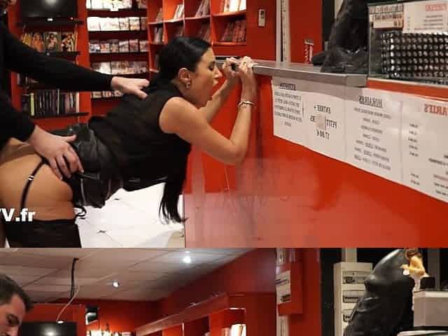 In a sex shop the red and horny slut gets fucked by the salesman's cock