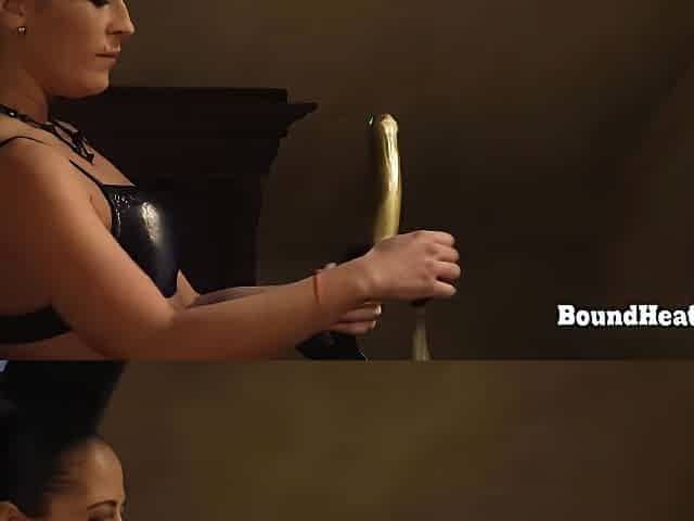 HARD GERMAN HEADMISTRESS trains slaves with horse sex toy thong-on