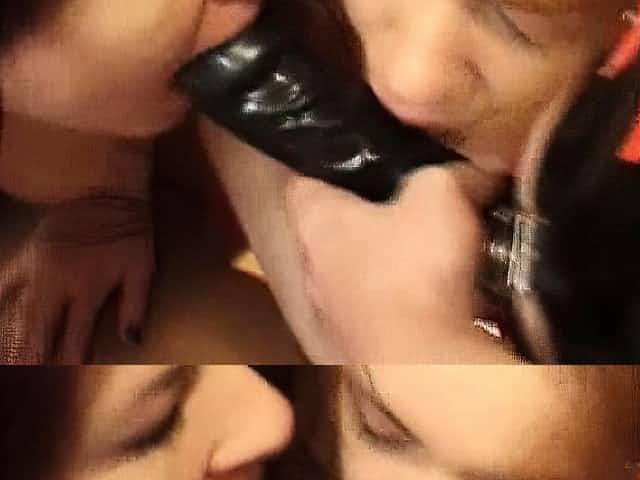 Lesbians sharing and licking a strap on dildo