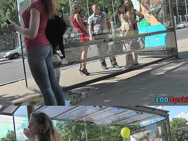Blonde was waiting a bus and caught on upskirt camera