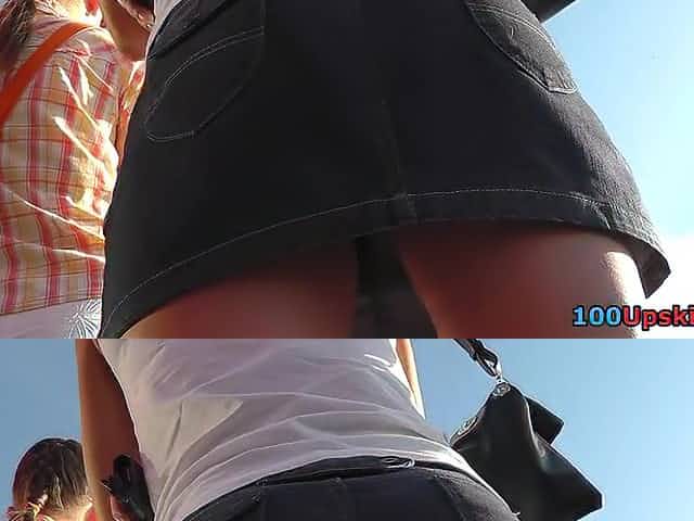 Two adorable girlfriends talk a lot in upskirt voyeur