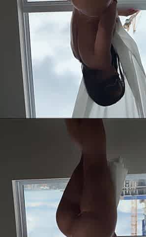 Brunette chick in white upskirt entertaining her boyfriend, Horny brunette babe starts chatting with me and then starts to strip