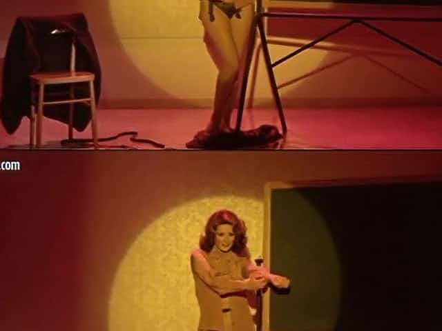 Alluring stripper girl spreads stocking legs wide open