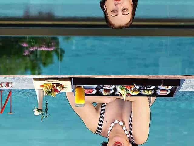 Regina Noir. Melons teasing at swimming pool. Nudist hotel. Nudism outdoors.