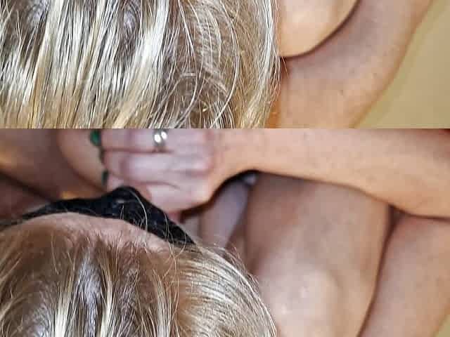 Submissive slut MILF sucking a big cock until he cums in her throat
