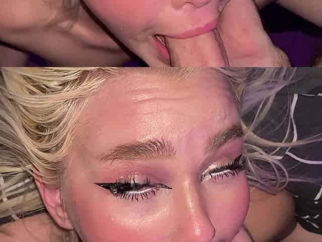 Blonde Haley Spades gets a messy hot load in her mouth.