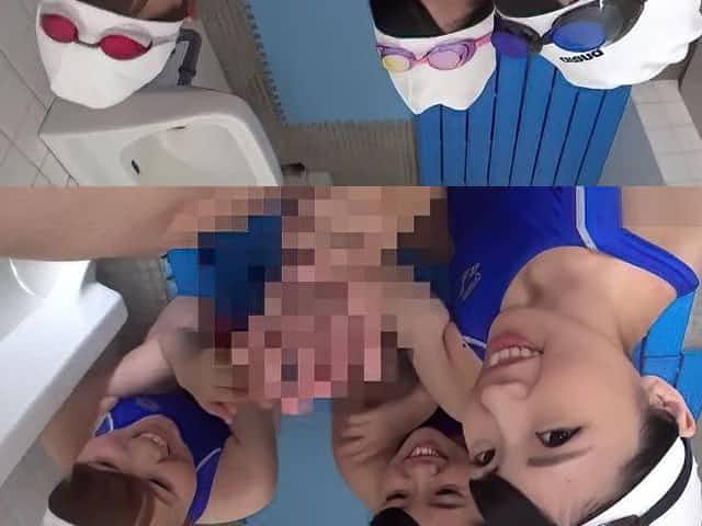 Japanese cutie wearing a swimsuit gives a blowjob in the locker room