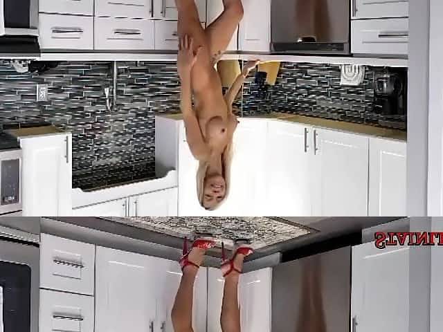 Tall blond woman with large, firm bazookas is rubbing her moist vagina in the kitchen
