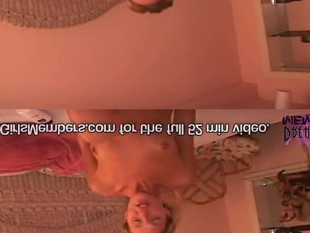golden-haired babe in schoolgirl petticoat fingers her hairless snatch