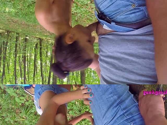 Teen suck cock in the woods and then masturbates next to a tree