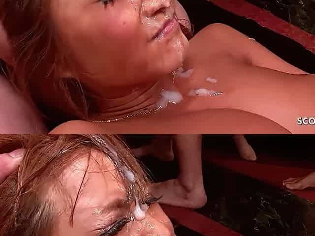 cute german teen enjoys her first rough blow bang bukkake party orgy