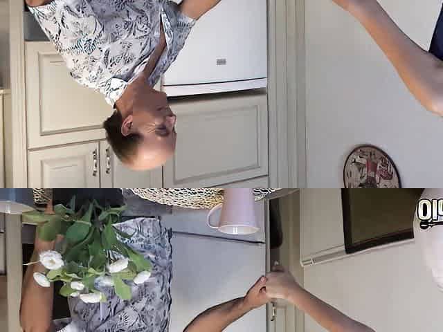 Long haired brunette teen Marselina Fiore swallows cum in the kitchen