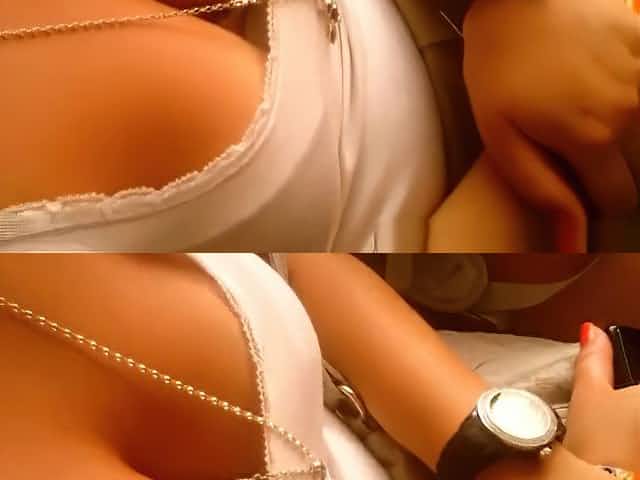 Teen rubs tits downblouse and masturbates pussy up skirt