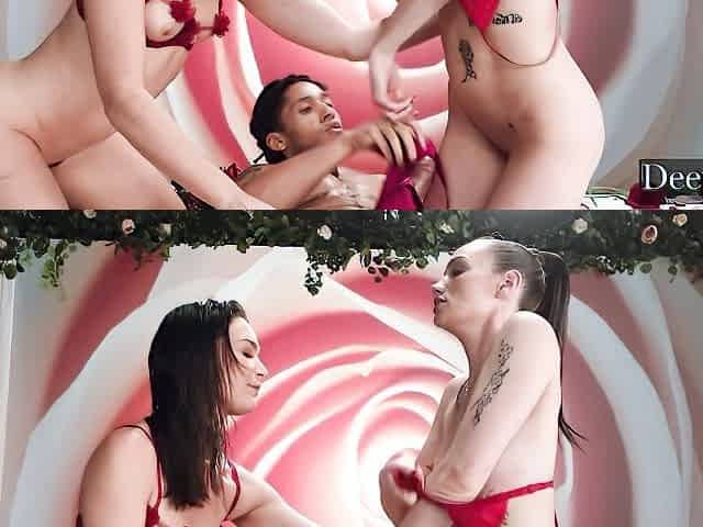 POV 3some fuck with two brunettes Celestina Blooms and Violet Moore