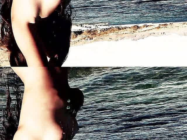 Hot blonde babe posing naked on the beach