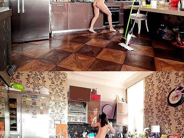 Sexy wife fun dancing naked while cleaning the house