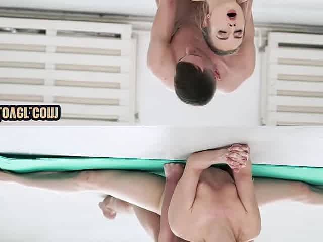 Foot model with flexible body gives footjob on yoga sex