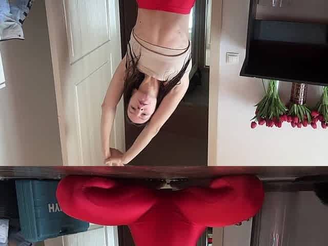 Stretching in New Red Leggings