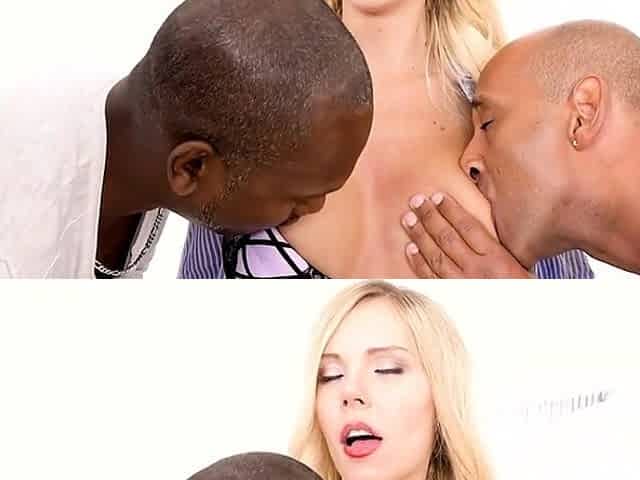 Sensual blonde displays her hot body and then fucks two black sticks